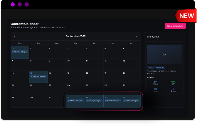 Automate your posting with the AI Content Scheduler, which auto-publishes videos to TikTok, YouTube, Instagram, and more. Schedule your content once, and let the system keep your profiles active 24/7.